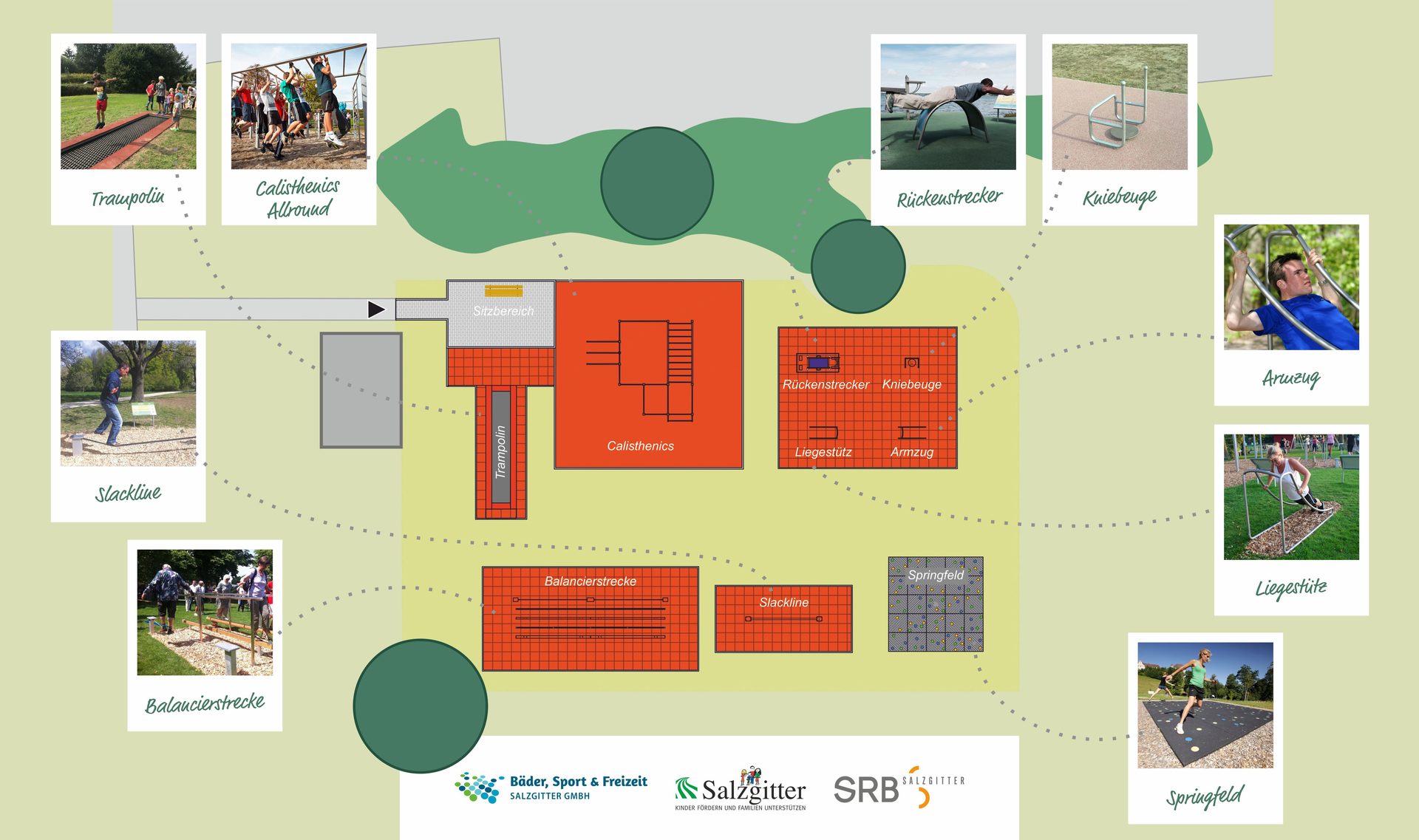 Bei uns am Thermalsolbad entstand auf Initiative der Physiotherapeutin Edda Alex und mit Unterstützung des "Lions-Club Salzgitter-Schloß Salder" sowie zahlreicher Förderer*innen und der Stadt Salzgitter ein Fitnesspark unter freiem Himmel, der für alle kostenfrei und öffentlich zugänglich ist.